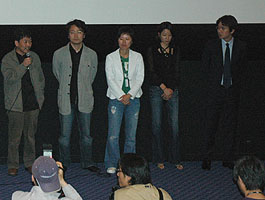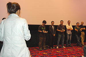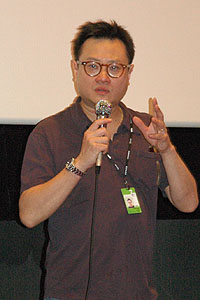 | Uma mulher de Singapura mostra-se descontente com o filme de Eric Khoo, acusando-o de ser demasiado duro. Na sessão estiveram também presentes, além de Khoo (foto ampliável, à direita), os realizadores Pen-ek Ratanaruang e Darezhan Omirbayev. |