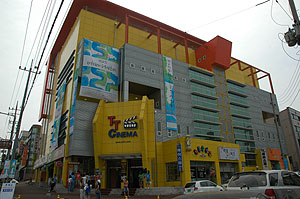 | Em cima: edifício do TTC, multiplex de quatro salas, sede do JIMFF. Em baixo: rua de Jecheon onde se situa o TTC. |