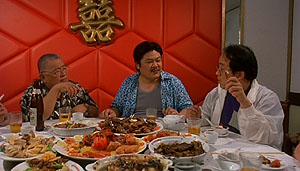 Uma discussão sobre dietas eficazes, perante uma mesa bem servida. Dois actores habituais nos filmes de To, Wong Tin-lam e Lam Suet, dão os seus contributos (à esquerda). Entretanto, Mini continua com o pé bem pesado e tendências depressivas. |