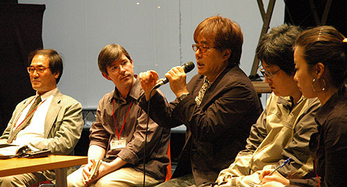 | Da esquerda para a direita: Bae Chan-ho, Darcy Paquet, Park Cheol-su (com o microfone), Byeon Yeong-ju e a tradutora. |