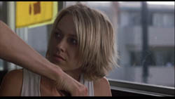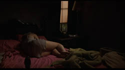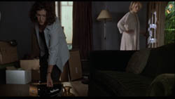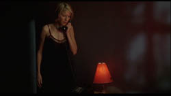 Diane leva o café para o sofá. Aqui insere-se um flashback, quando Diane sai do enquadramento pela esquerda e a câmara passa por cima do sofá, revelando Camilla deitada, semi-nua (fig. 11 e 12). A sequência contínua pode parecer desconcertante à primeira vista, mas note-se como Lynch cuidadosamente mostra as diferenças entre o tempo presente e o flashback: no plano seguinte, Diane surge com calções de ganga, que obviamente não tinha antes, e, na mão, já não tem uma caneca com café, mas um copo, talvez com água. Importante: na mesa está ainda o cinzeiro (a acção passa-se no período de três semanas, depois da troca de apartamentos e antes de Diane “desaparecer”) mas não a chave azul. Logo, não se trata de um sonho ou uma visão, mas um de flashback “puro”. Isto é bastante claro, em particular num segundo visionamento, pois existem zooms lentos até à chave azul e ao cinzeiro, no presente, e até ao cinzeiro (e à não-presença da chave) no flashback. Em seguida, assistimos à rejeição e à recusa de Diane em aceitar as coisas pacificamente (fig. 13 e 14).